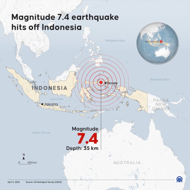 The 7.4-magnitude quake struck in the Molucca Sea between the Sulawesi and Maluku island groups (Picture: Anadolu via Getty Images)