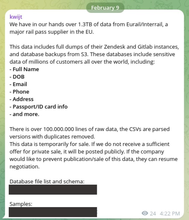 Hackers saying on the dark web they have obtained ‘millions’ of people’s data – Eurail says an exact number is unclear: (Picture: Cybernews)