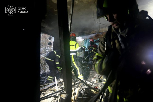 Ukrainian firemen clean the debris inside a destroyed residential building following an air attack in Kyiv (Picture: Ukrainian Emergency Service / AFP)