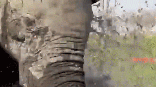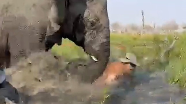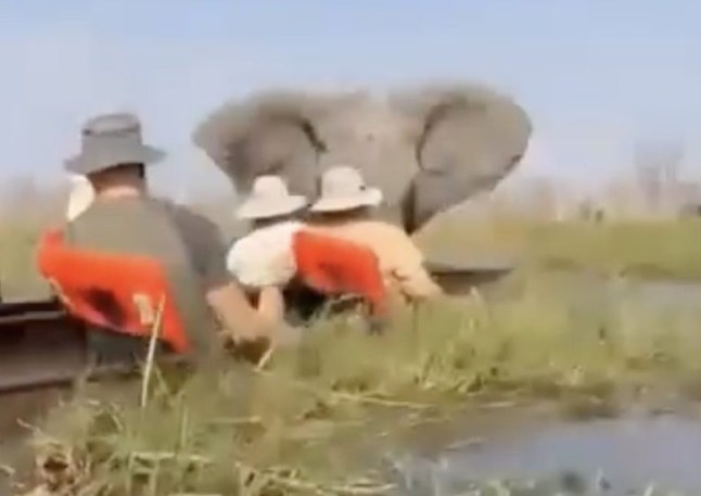 Footage of the incident showed the bull elephant run directly towards the group,who were paddling in the shallow Okovango Delta in Botswana on Saturday.