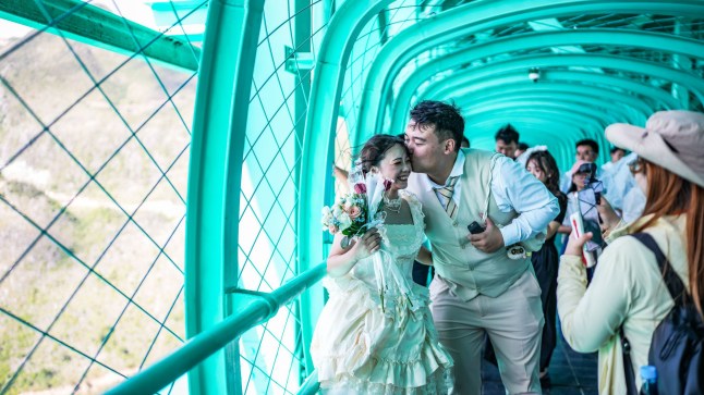 Newlyweds pose for photos at the newly opened bridge yesterday (Picture: Xinhua/Shutterstock)