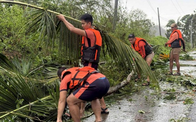 Philippine Coast Guard personnel conducting road-clearing operations in Catanduanes province today (Picture: EPA)